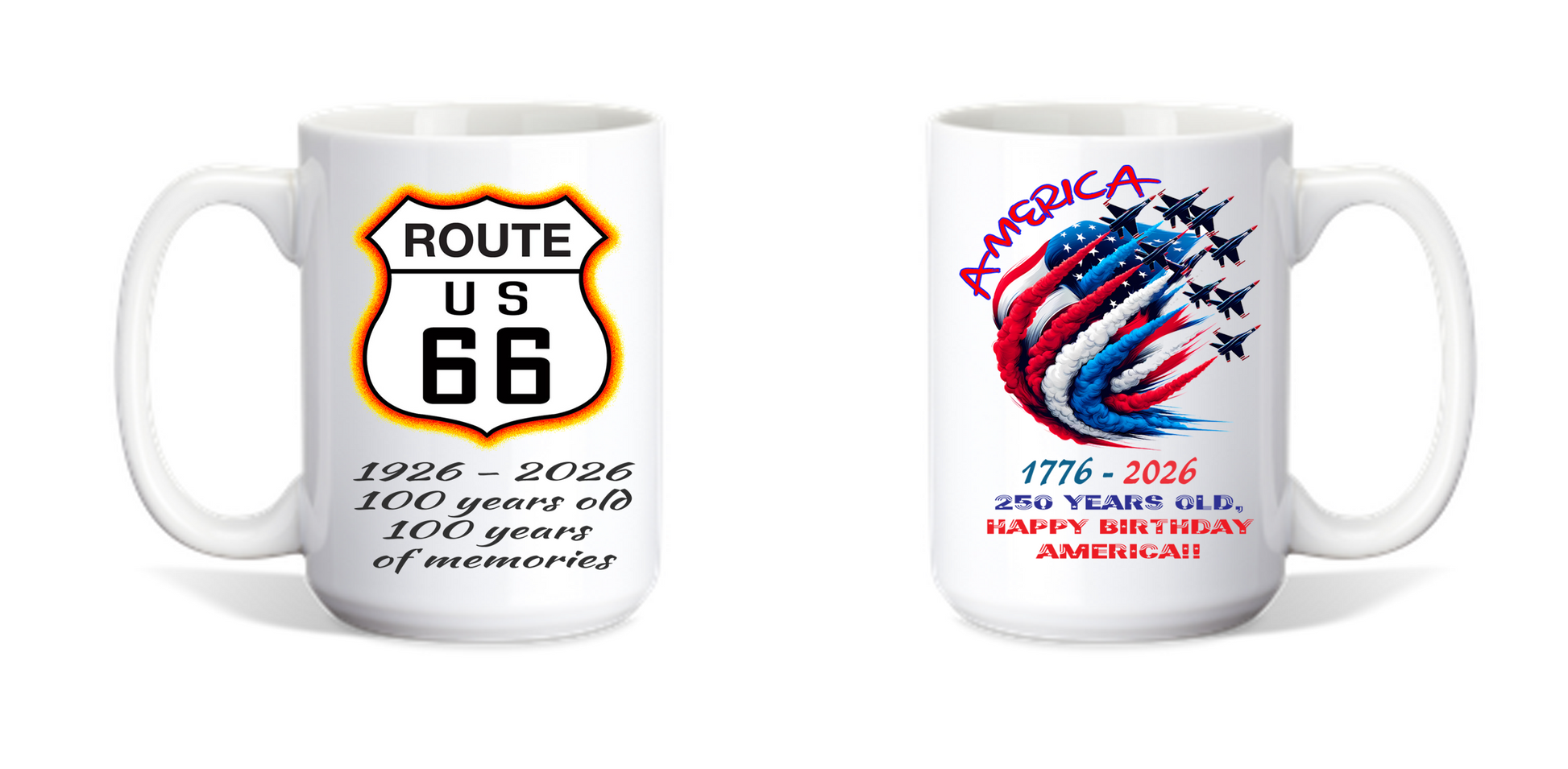 Coffee Mug Celebrating America's Birth year and Route 66's Birth Year in 2026