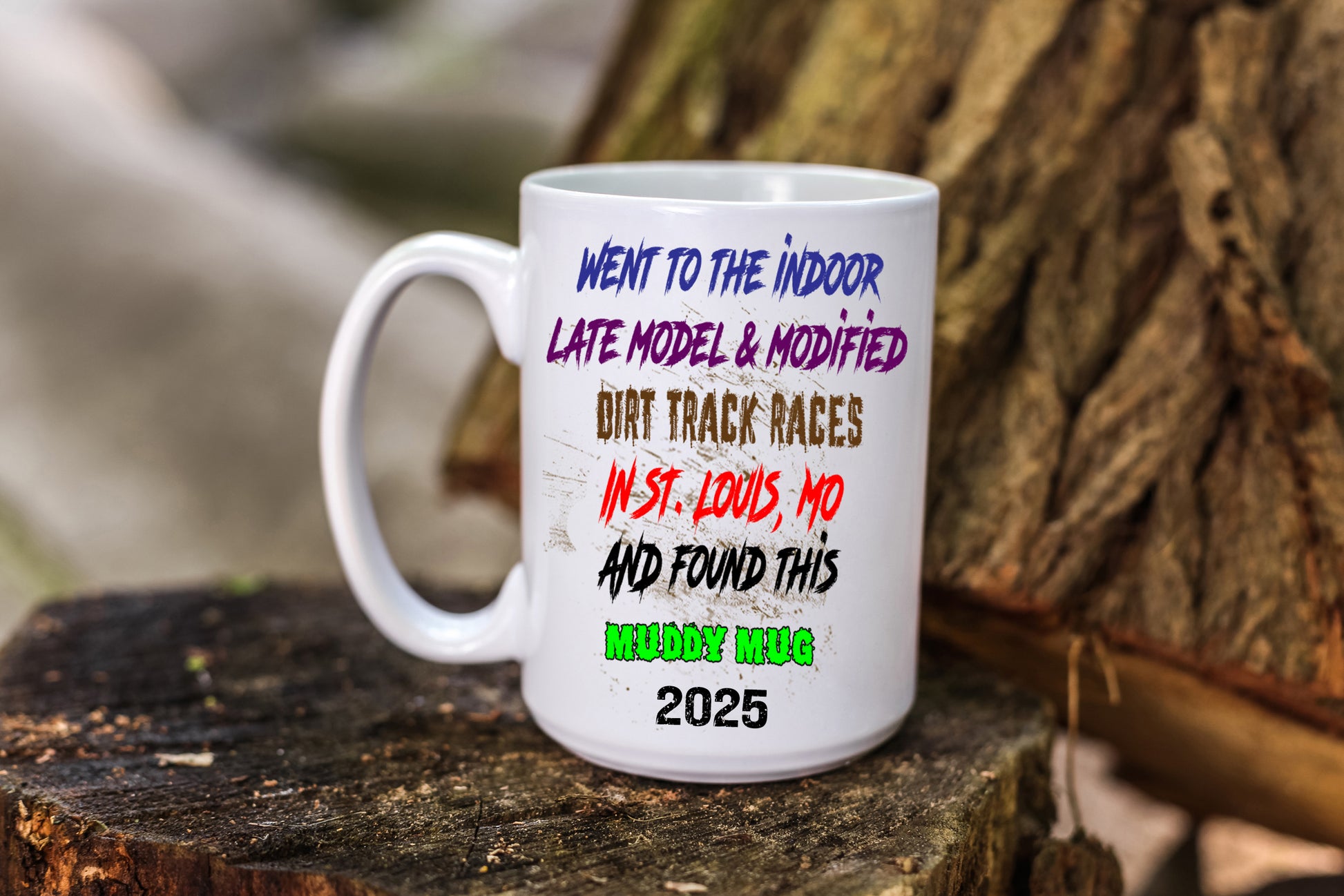Coffee Mug featuring graphics mud spots all over the mug with the phrase: Went to the indoor late model and modified dirt track races in St. Louis, MOI and found this muddy mug to celebrate the indoor racing at the Dome. Graphics in the center are a Route 66 shield with mud all over it as well.