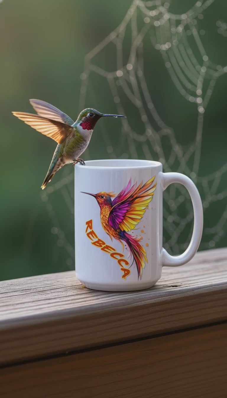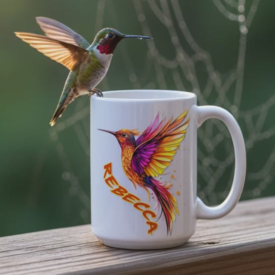 Coffee Mug Featuring a Colorful Hummingbird in Flight Personalized With Name of Choice