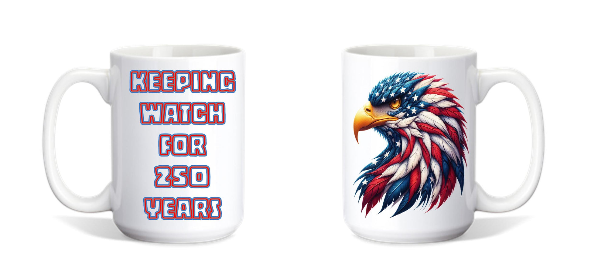 > Has a red,white,blue Bald eagle head and a quote on the other side, Keeping Watch For 250 Years, with the dates 1776-2026 in between the two images