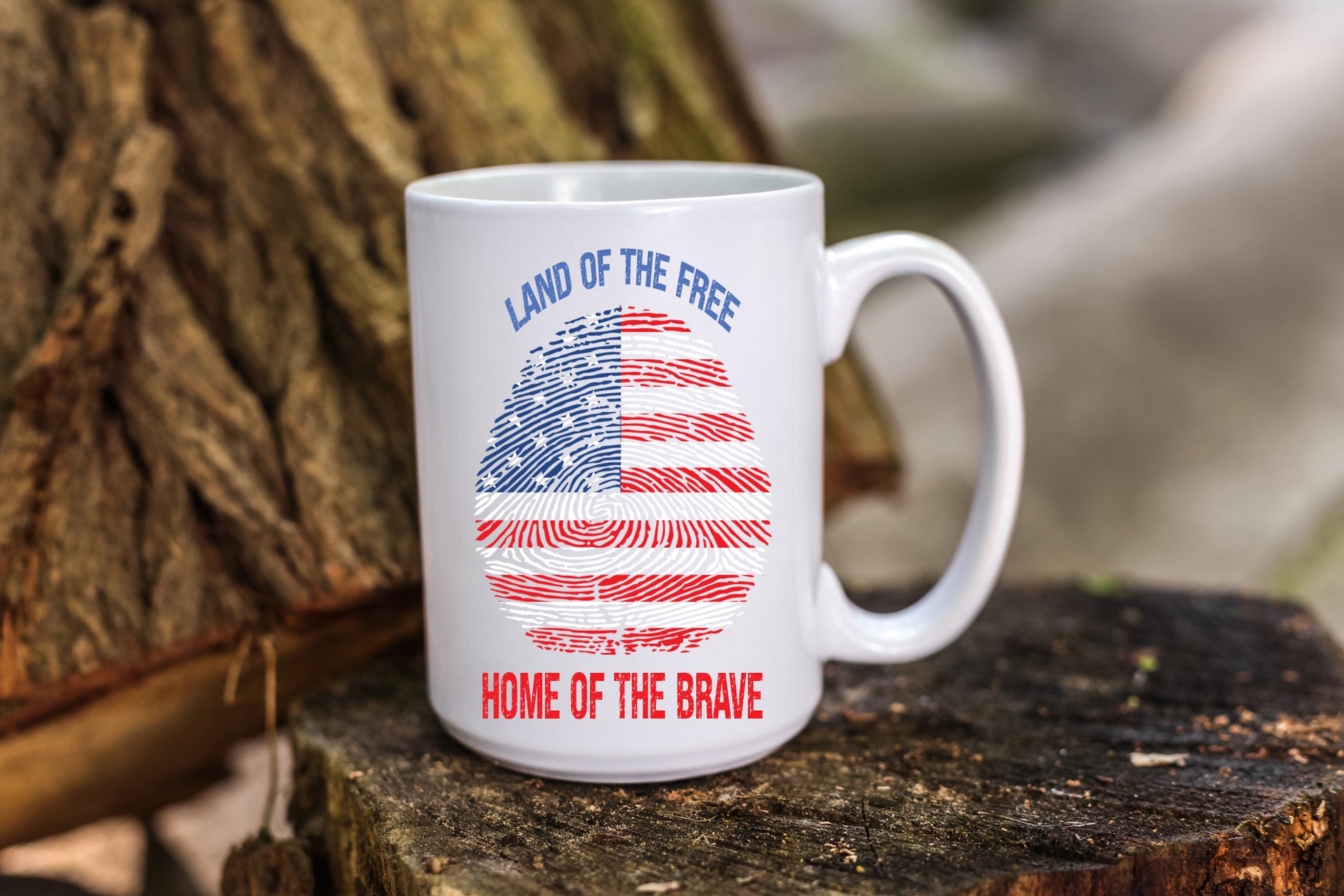 Coffee Mug featuring a patriotic fingerprint with the words, "LAND OF THE FREE, HOME OF THE BRAVE".