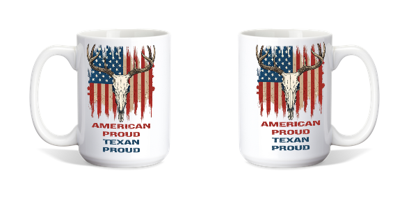 Both sides of coffee mug have a skull against an American Flag with the words, "American Pride, Texan Pride"..