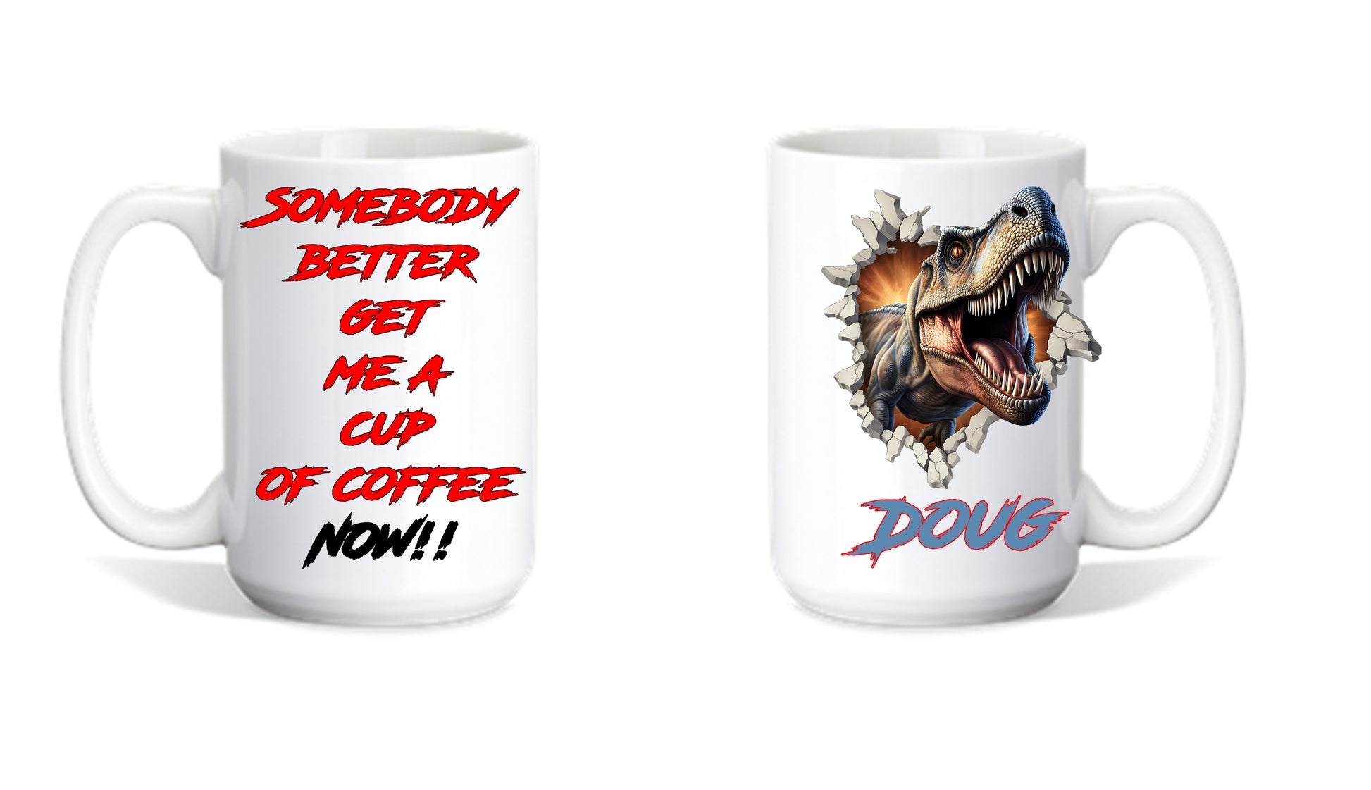 Coffee Mug featuring dinosaur graphics on one side and the phrase, somebody better get me a cup of coffee, NOW!!