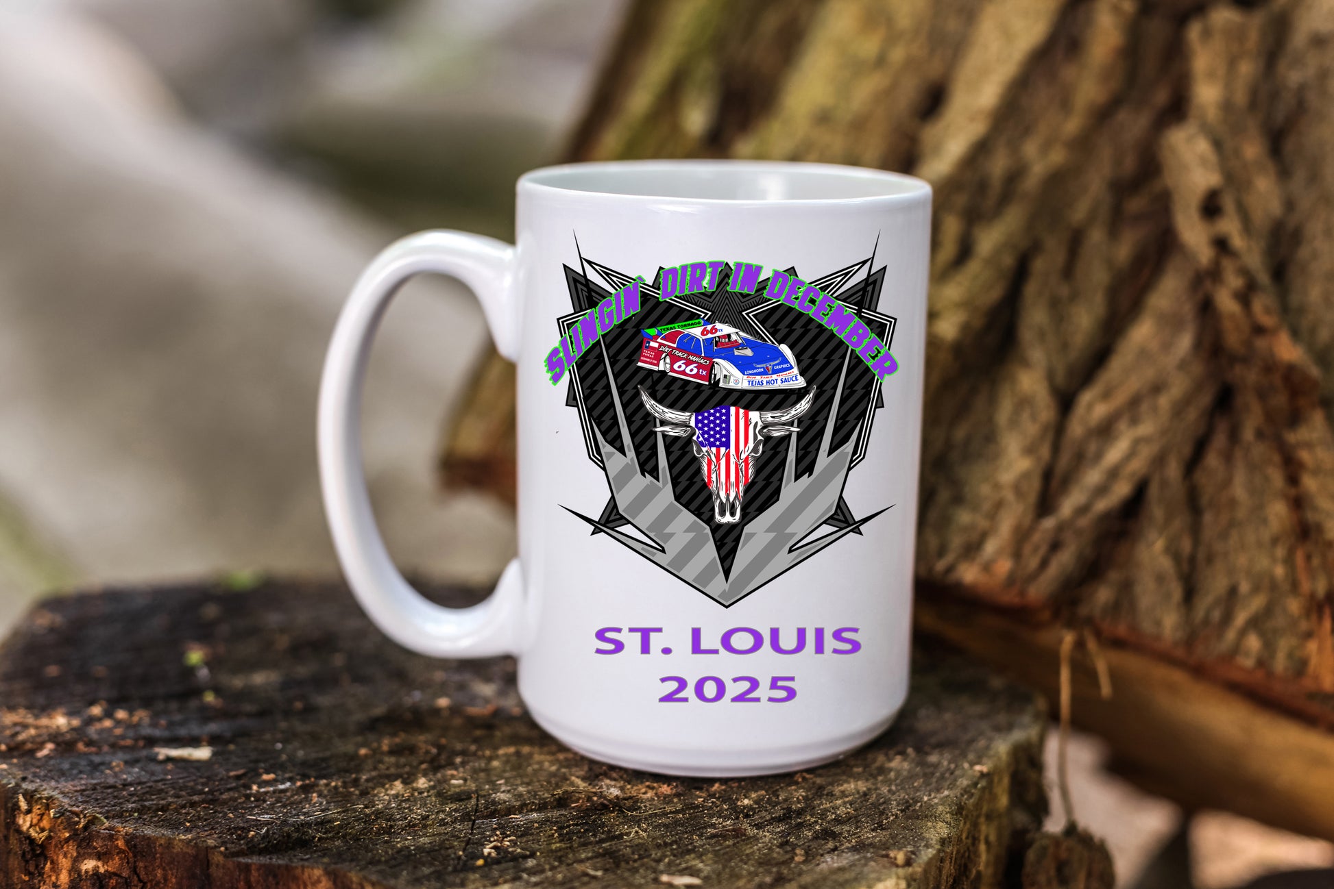 Coffee Mug featuring unique graphics of Slingin' Dirt in December to celebrate the indoor racing at the Dome. Graphics in the center is a Route 66 shield.